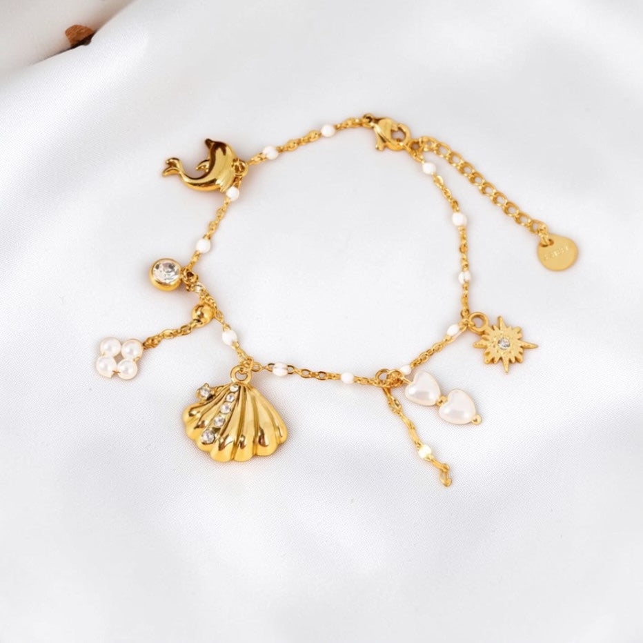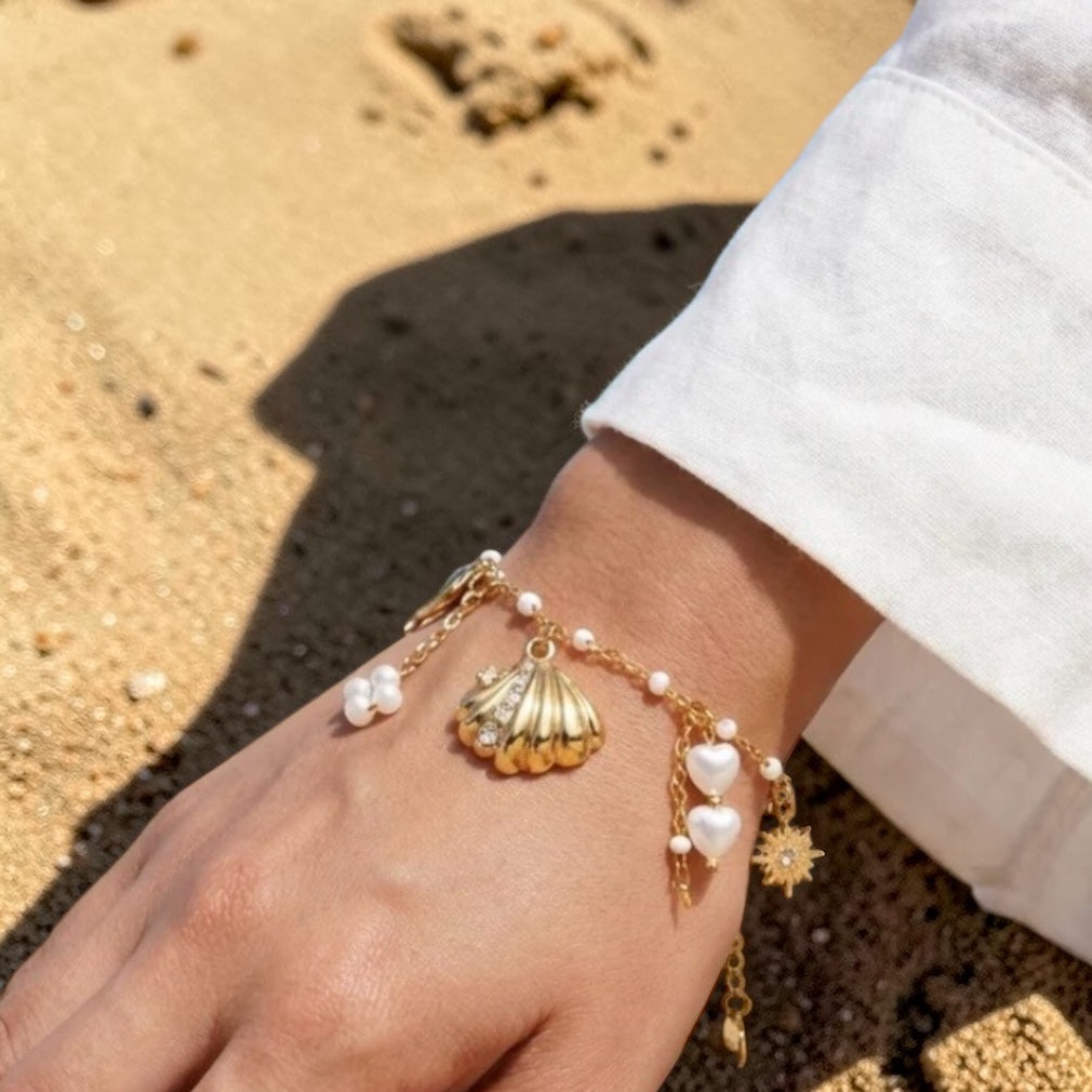 Ses breloques inspirées de la mer – coquillage, étoile solaire, perles et cœurs nacrés – créent un bijou harmonieux aux accents bord de mer chic.