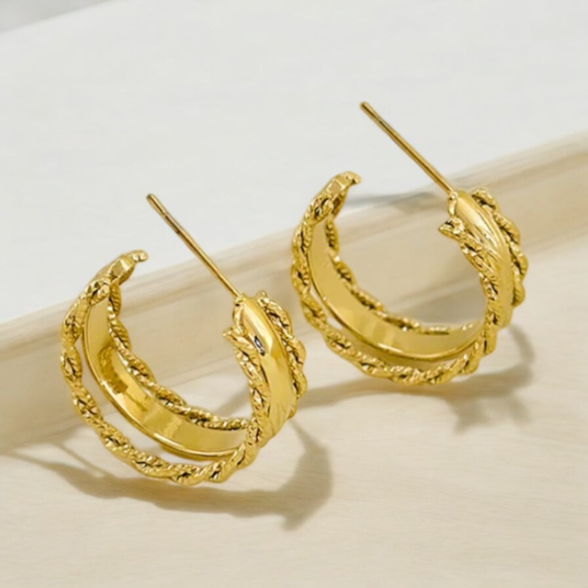 Boucles d'Oreilles Dorées Créoles Ouvertes Double Fils Torsadés Et Bande.