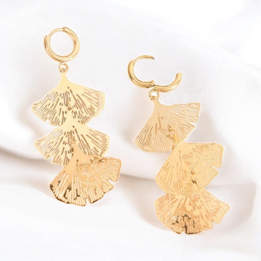Boucles d'Oreilles Créoles Pendantes Dorées Feuilles De Ginkgo Biloba Ajourées.