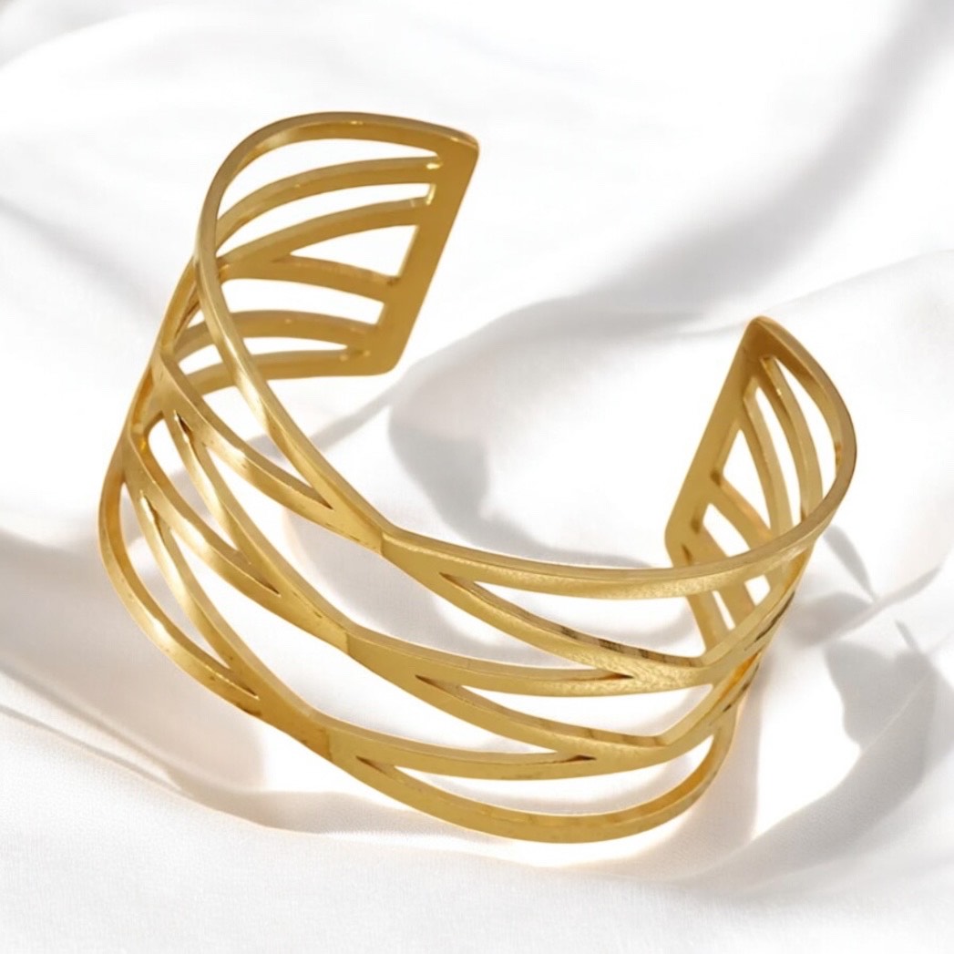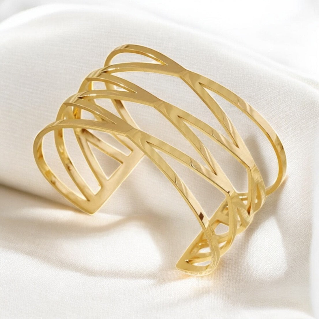 Bracelet Manchette Dorée Ajourée À Motifs Entrelacés.