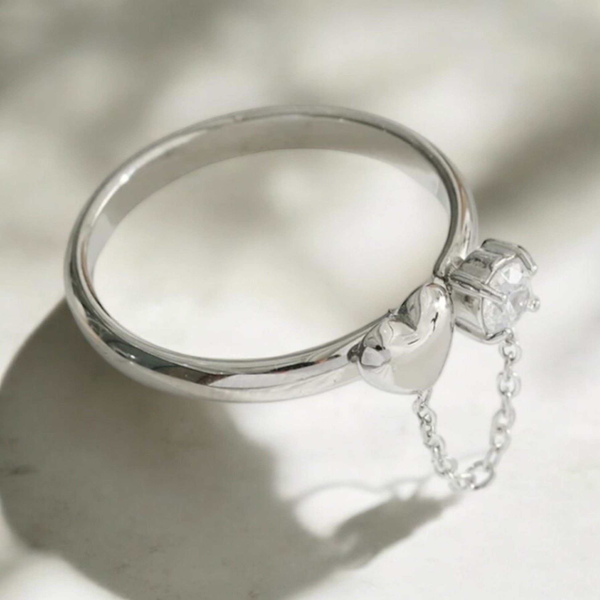 Bague Argentée Cœur Et Strass Avec Chaîne